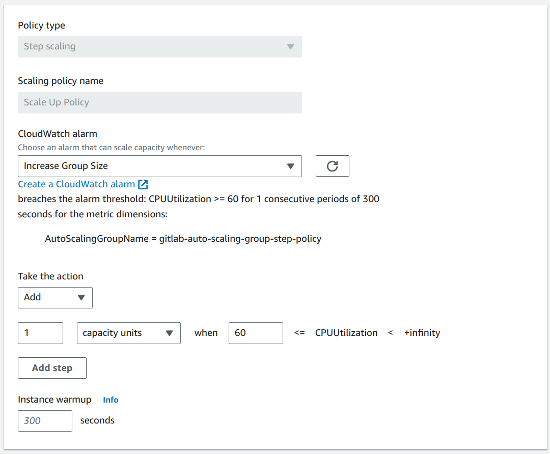 1capacity unit whenCPUUtilizationis greater than or equal to 60%. - Set the Scaling policy name to