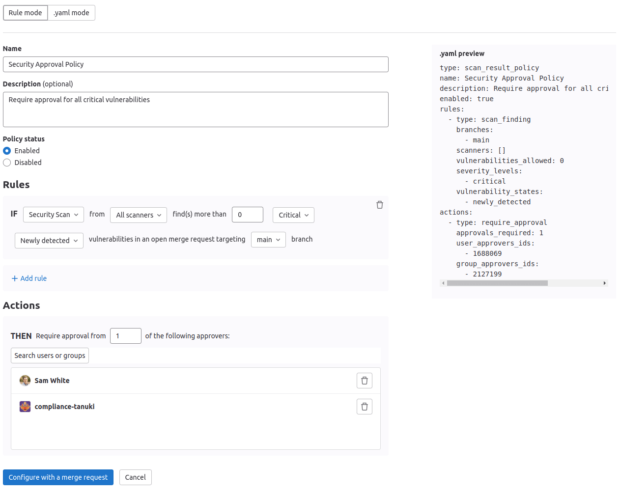 - Merge request approval policy. Enforce project-level settings and approval rules based on scan results.